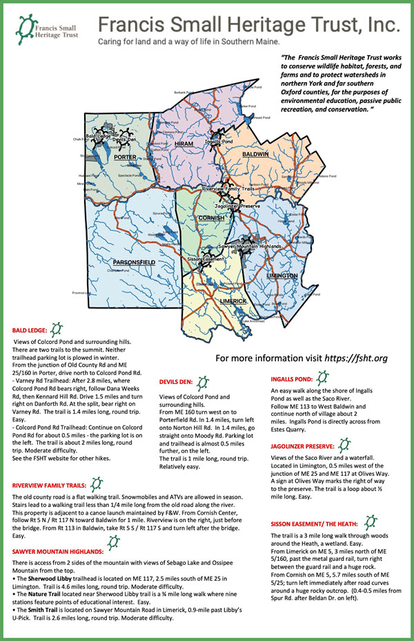 The Francis Small Heritage Trust also holds several conservation easements on private property, including: The Piper-Pomeroy Farm, The Charles E. Cole Farm, The Chadbourne-Hanscom Farm and The Chadbourne-Hutchinson Overlook.